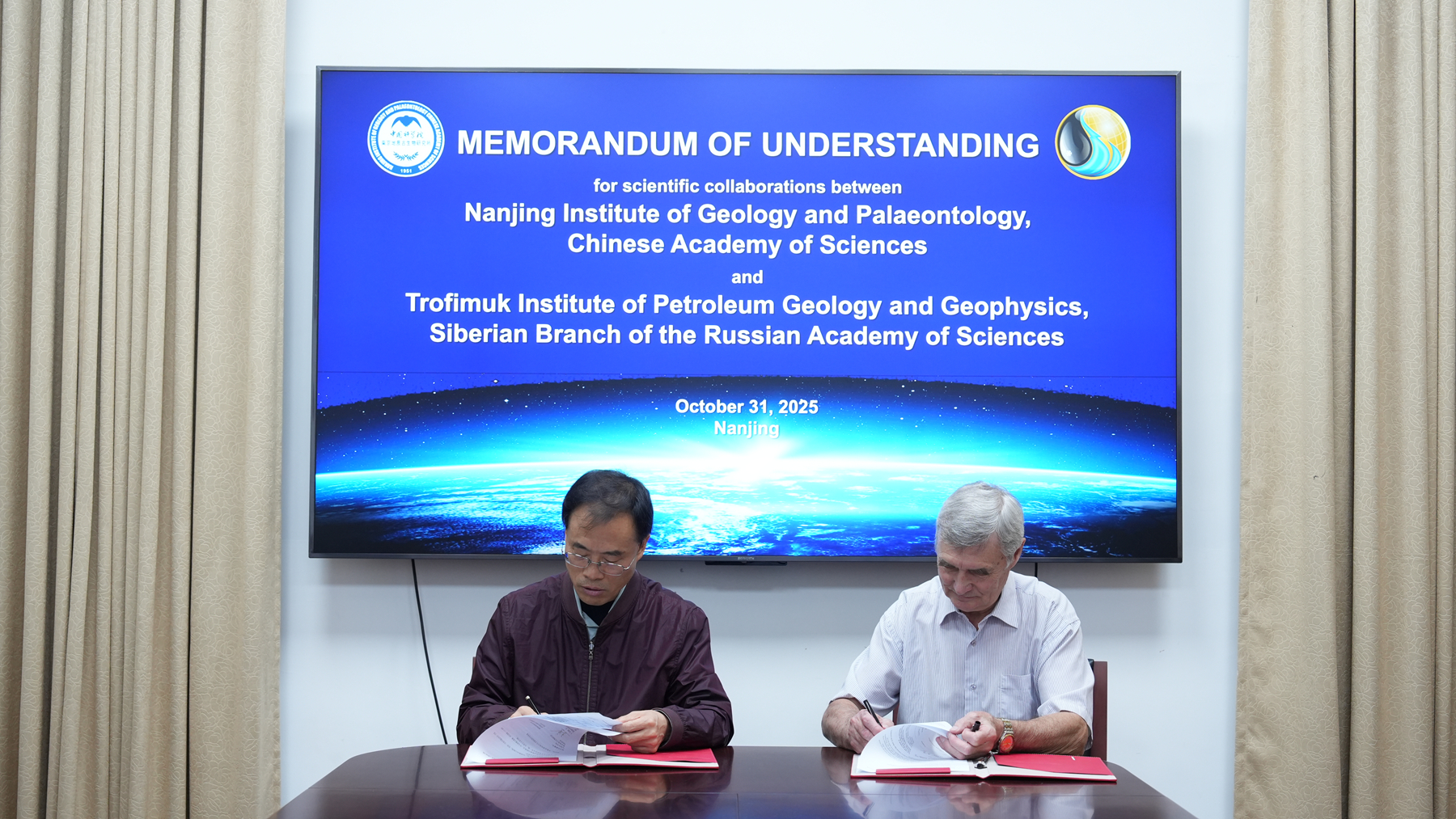 On October 31st, 2025, Nanjing Institute of Geology and Palaeontology, Chinese Academy of Sciences (NIGPAS) and Trofimuk Institute of Petroleum Geology and Geophysics, Siberian Branch of the Russian Academy of Sciences (IPGG SB RAS) signed the Memorandum of Understanding (MoU). Research Professor WANG Jun, director of NIGPAS, and Professor of IPGG SB RAS, Nikolay Sennikov, signed the MoU on behalf of their respective institutes.