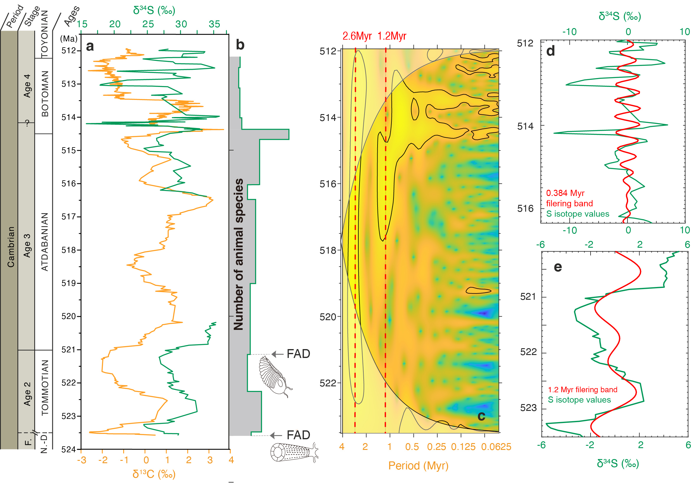 Fig.1 Carbonate carbon and carbonate-associated sulfate sulfur isotopes. (a) Records from Cambrian Stage 2 to Stage 4 from the southeastern Siberian Platform. (b) Number of animal species. (c) Wavelet analysis of the carbon isotope record, and (d–e) 384 Kyr and 1.2 Myr filter output from the sulfur isotope record.
