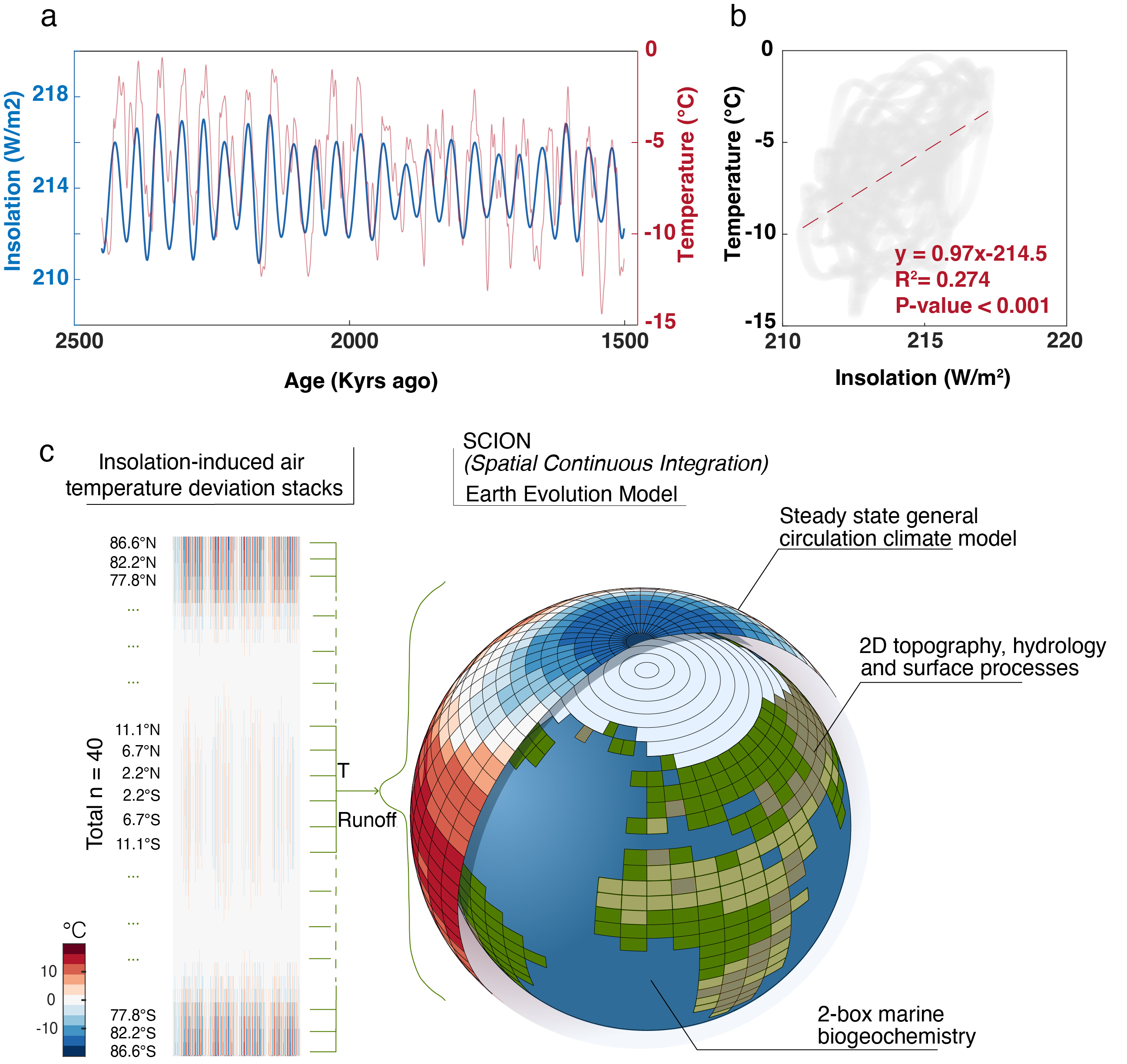 Fig.2 Orbitally induced climate approximation in the SCION model. (a) Comparison of solar insolation at 65°N with air temperature variations over 40–80°N in the past 1500–2450 kyr. (b) A cross plot of solar insolation at 65°N with the air temperatures. (c) Insolation-induced air temperature 2D deviation stacks in the revised SCION model schematic diagram.