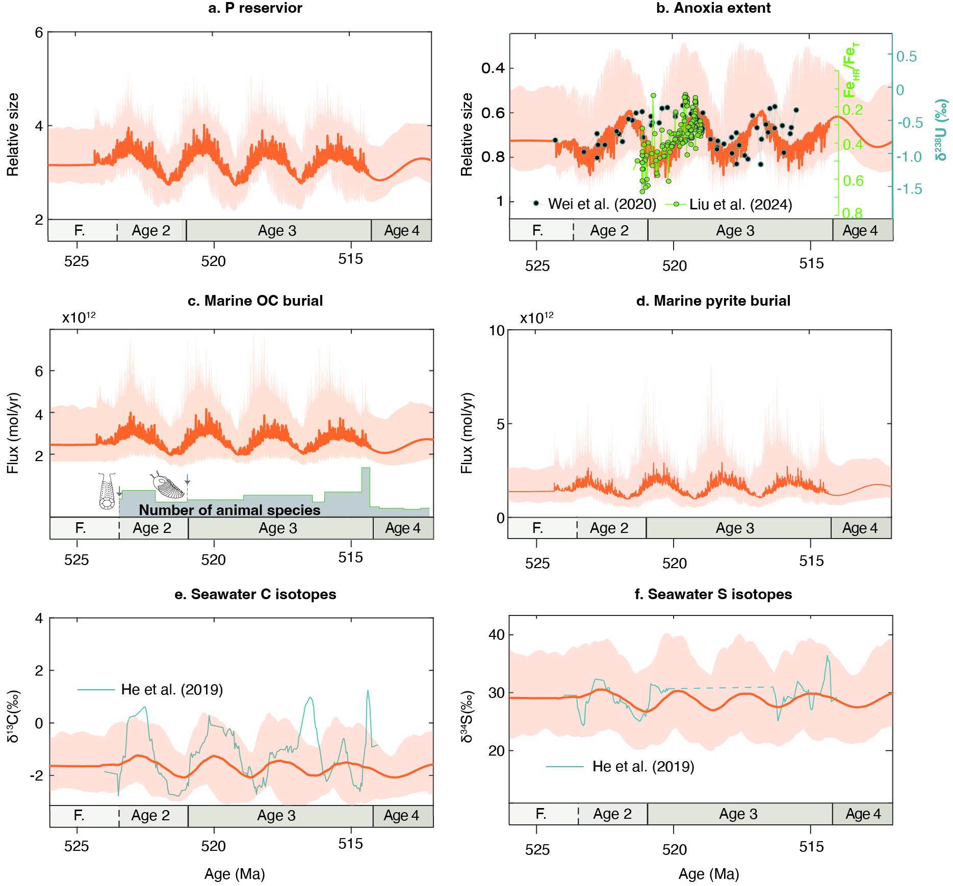 Fig.3 SCION model outputs with key parameters varied within 20% uncertainty. (a) shelf nutrient phosphorus reservoir size. (b) anoxic seafloor extent compared to uranium isotope and iron speciation data. (c–d) marine organic carbon and pyrite burial on the shelf. (e–f) carbon-sulfur isotopes.