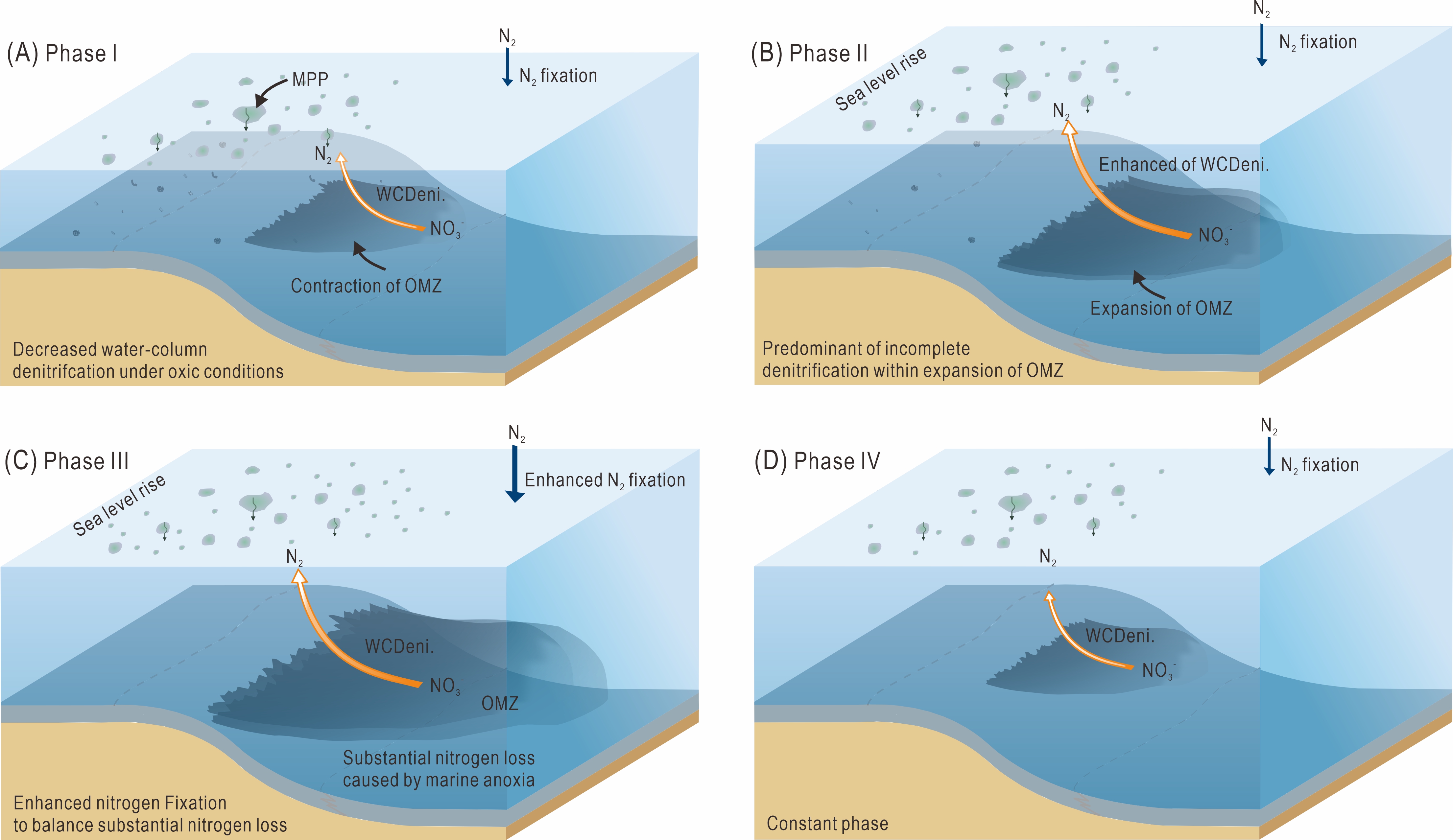 High-resolution sedimentary δ15N, δ13Corg, and δ13Ccarb records were reported from the Luodian Basin, South China during the KGB warming event of the LPIA. The perturbations of δ15N recorded in the three study sections indicate the changes in the nitrogen cycle and redox environments during the KGB warming event. The decrease of δ15N in phase Ⅰ indicates the decreased rate of water-column denitrification. The increase of δ15N in phase Ⅱ indicates the dominance of incomplete denitrification caused by the preliminary enhancement of oxygen depletion due to increase of SSTs. The dramatic negative δ15N excursion (by ~7‰) in phase Ⅲ immediately below the KGB coincides with the previously reported negative shift in δ13Corg, δ13Ccarb, and δ238U, and continued increase in atmospheric pCO2 and SSTs (Fig. 2) suggesting the potential linkage among these proxies. The pronounced negative shift in δ15N most likely resulted from enhanced nitrogen fixation, which was promoted by increased nitrogen loss due to denitrification during the warming-associated marine anoxia (Fig. 3). This paper demonstrates the response of the marine nitrogen cycle to the warming episodes in the icehouse climate and provides a reference case for the future study of the ocean nitrogen cycle in an interglacial climate.