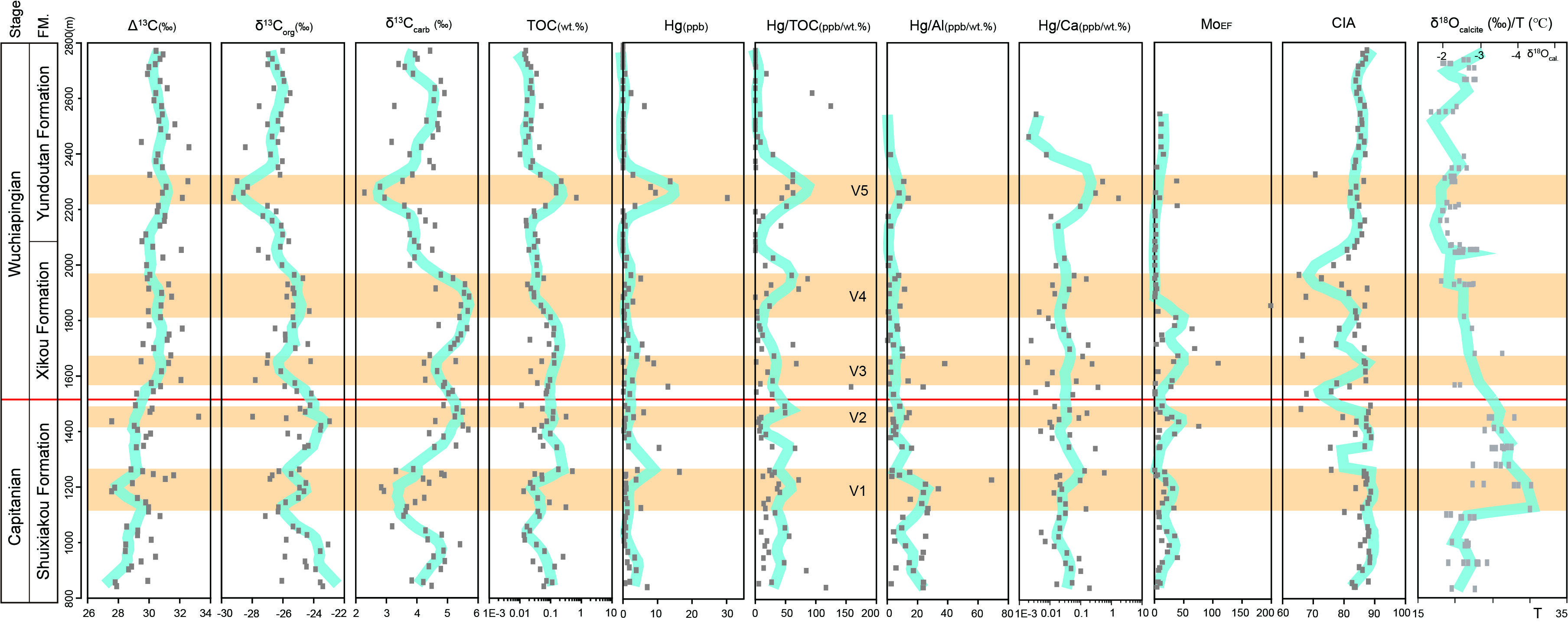 The research team conducted high-resolution integrated geochemical analyses of carbonate-dominated strata from the Xikou section in Zhen’an, South Qinling, including mercury geochemistry, paired carbonate and organic carbon isotopes (δ13Ccarb, δ13Corg), redox-sensitive trace elements (e.g., MoEF), and chemical weathering indices (e.g., chemical index of alteration, CIA). The results reveal five distinct volcanic pulses during the Capitanian to Wuchiapingian stages, each showing synchronous correspondence with negative carbon isotope excursions, elevated chemical weathering indices, and enrichments in redox-sensitive elements (Fig. 1).