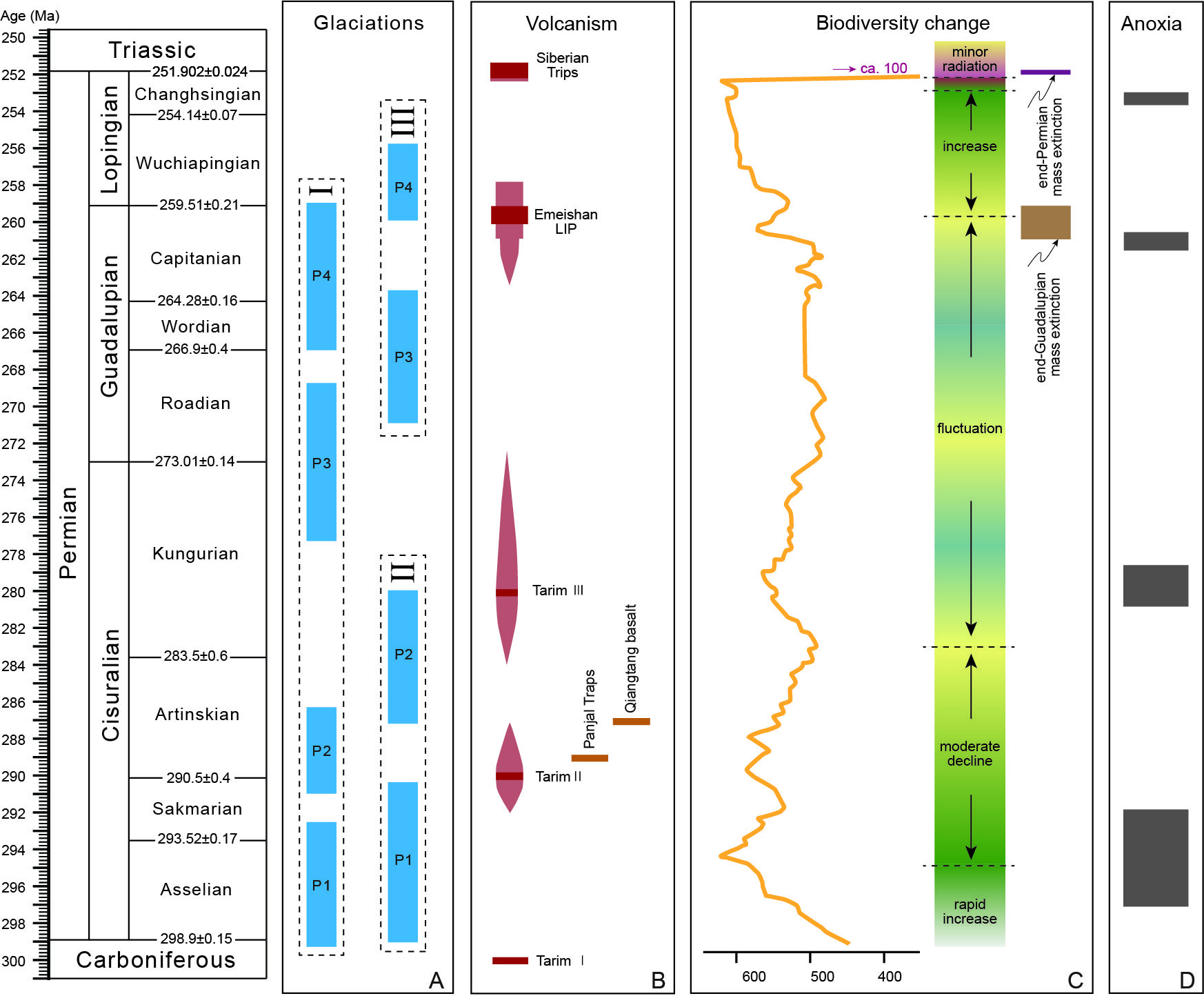 Fig. 2 Correlation among Permian glaciations from eastern Australia, Large Igneous Provinces, biodiversity changes, and anoxic events