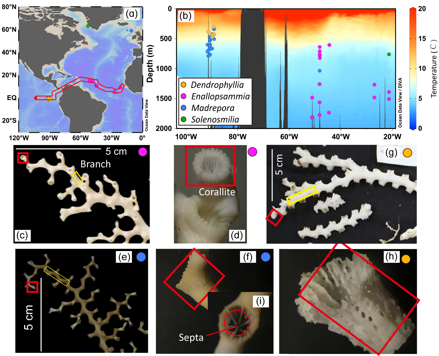 To isolate the drivers of geochemical variability, the researchers conducted a systematic analysis of 60 modern branching cold-water coral specimens collected from the North Atlantic, Equatorial Atlantic, and Eastern Equatorial Pacific. They performed comparative sampling of two distinct skeletal structures: the corallites (cup skeletons) and the branches (coenosteum). The results revealed a significant and systematic offset that trace element ratios such as Li/Ca, Mg/Ca, B/Ca, and notably Li/Mg, were consistently enriched in the corallites compared to the branches. Conversely, Sr/Ca and U/Ca ratios showed the opposite trend. After excluding the influence of Centers of Calcification (COC), the modeling results combined with existing inorganic precipitation experiments identified skeletal growth rate as the dominant factor controlling the Li/Mg offset between the two structures.