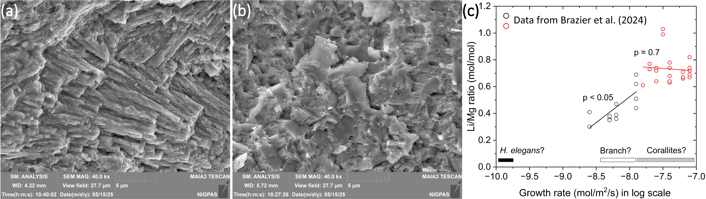 Fig.3 The SEM photos of (a) corallite and (b) branch with (c) the influence of growth rate on Li/Mg ratio