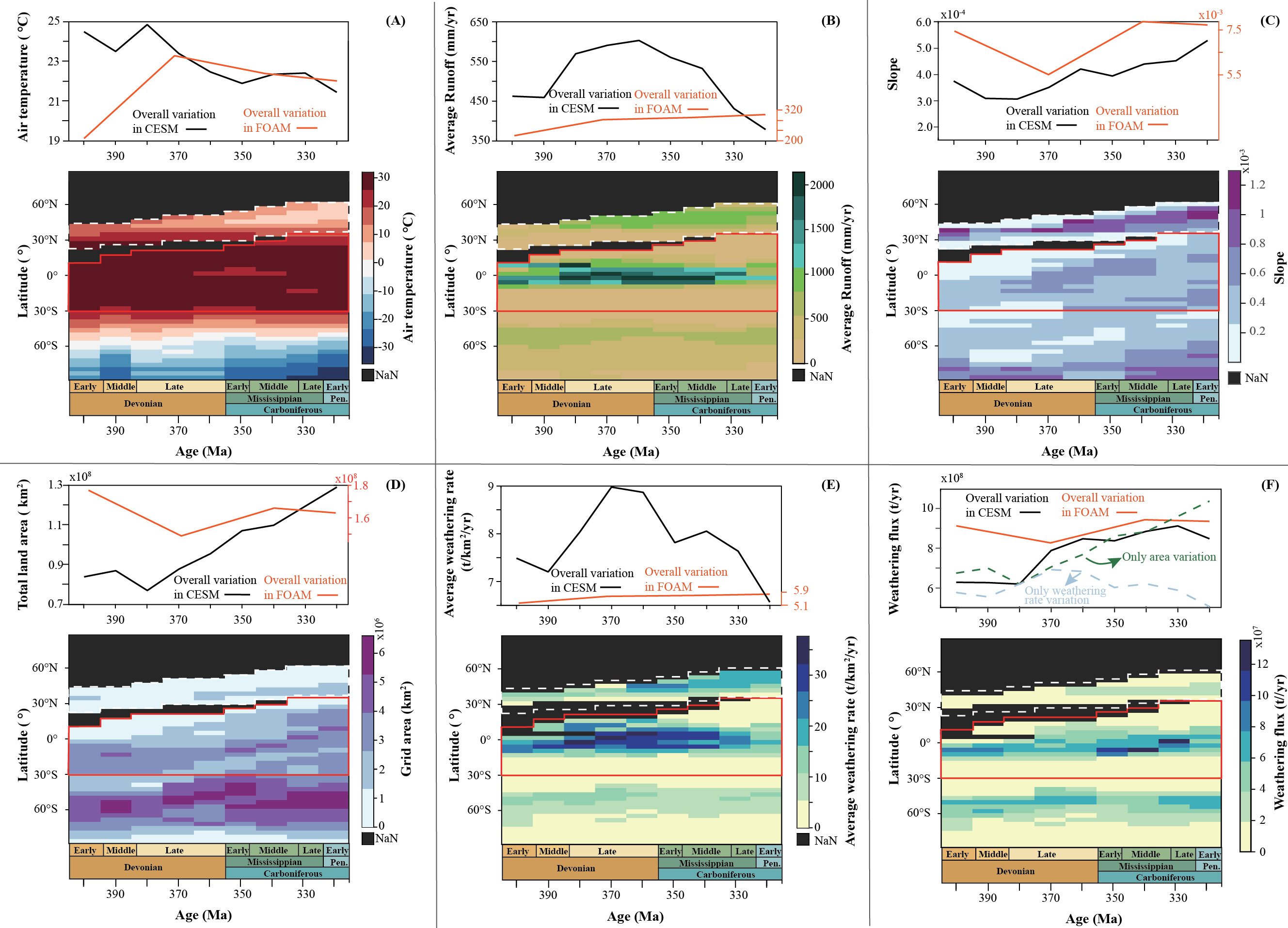 Modeling results show that during the mid-to-late Devonian, the assembly of Pangea was accompanied by a long-term global sea-level fall (marine regression). With the improved resolution, the CESM-SCION model quantified the “dual cooling effect” of this process. The increased global continental exposure caused by marine regression acted in two ways: first, it induced physical cooling by increasing global surface albedo; second, it vastly expanded the regions available for silicate weathering, thereby enhancing the global silicate weathering flux. This accelerated the consumption of atmospheric CO2, driving global cooling. This result not only replicates the critical transition from greenhouse to icehouse conditions in the mid-to-late Devonian but also proposes a new perspective: “Tectonically driven marine regression preceded and drove the Late Paleozoic Ice Age”.