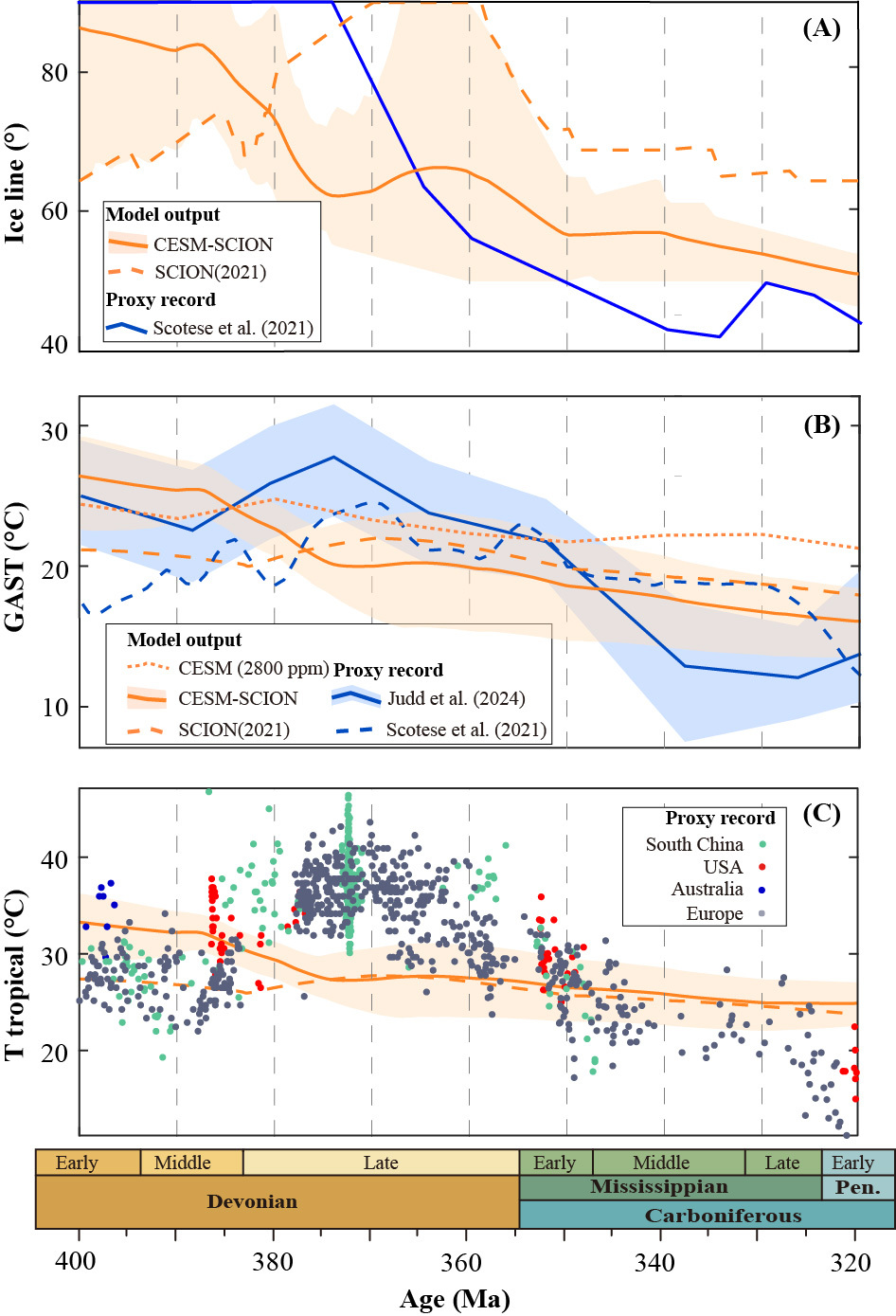Earth system box models are essential tools for reconstructing long-term climatic and environmental evolution and for uncovering the Earth system mechanisms. To break through the spatial and temporal resolution limits of current deep-time models, Dr. ZHANG Yinggang from the team of Prof. ZHU Maoyan at the Nanjing Institute of Geology and Palaeontology, Chinese Academy of Sciences (NIGPAS), collaborated with Prof. HU Yongyunand Dr. YUAN Shuai from Peking University, Prof. Benjamin Mills from the University of Leeds, and Dr. Andrew Merdith from the University of Adelaide. Together, they developed CESM-SCION, a new generation high-resolution climate-biogeochemistry coupled model. This model increases the spatiotemporal resolution of long-term Earth system simulations to a new level and identifies marine regression as a key driver for the onset of the Late Paleozoic Ice Age. The findings were recently published in the journal Geophysical Research Letters.