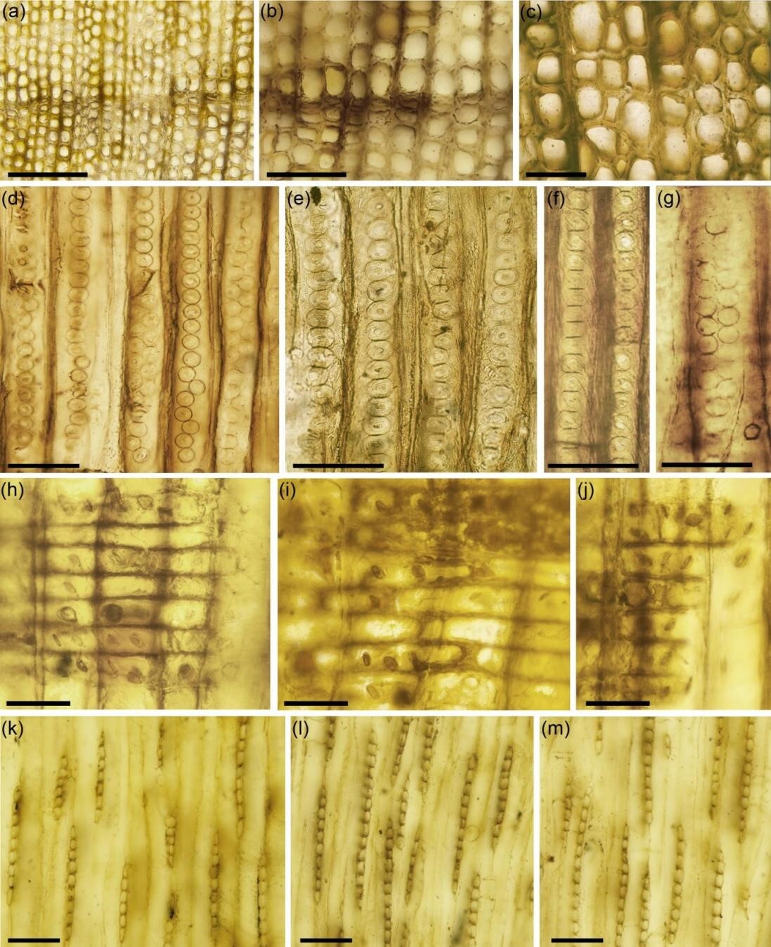 Fig.1 The anatomical features of fossil conifer wood, Protopodocarpoxylon jingangshanense Ding, from the Early Cretaceous Yixian Formation in western Liaoning, China. (a-c, cross sections; d-j, radial sections; k-m, tangential sections)