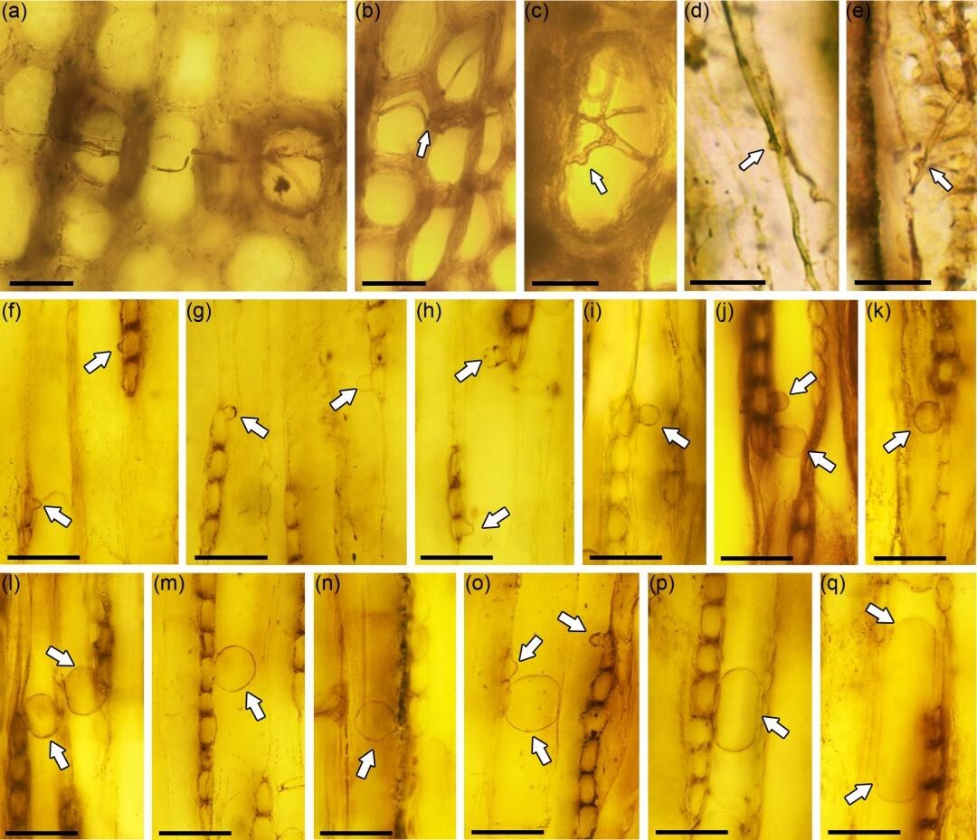 Fig.2 Fungal hyphae (a-e) and tyloses at different developmental stages (f-q) within the wood fossil