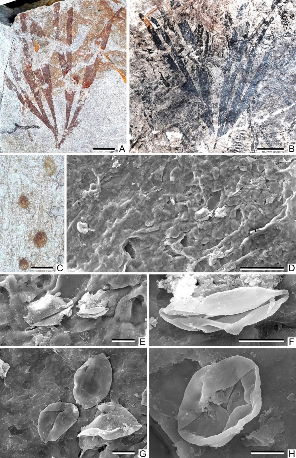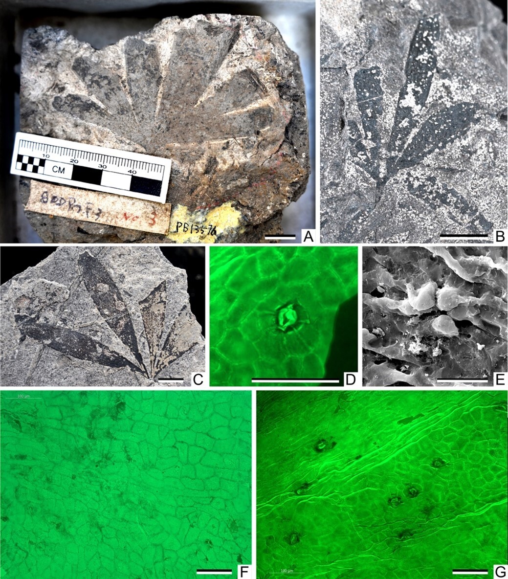 Fig.3 Presentative leaf fossil specimens of Baiera concinna with cuticular structure and associated pollen grains.