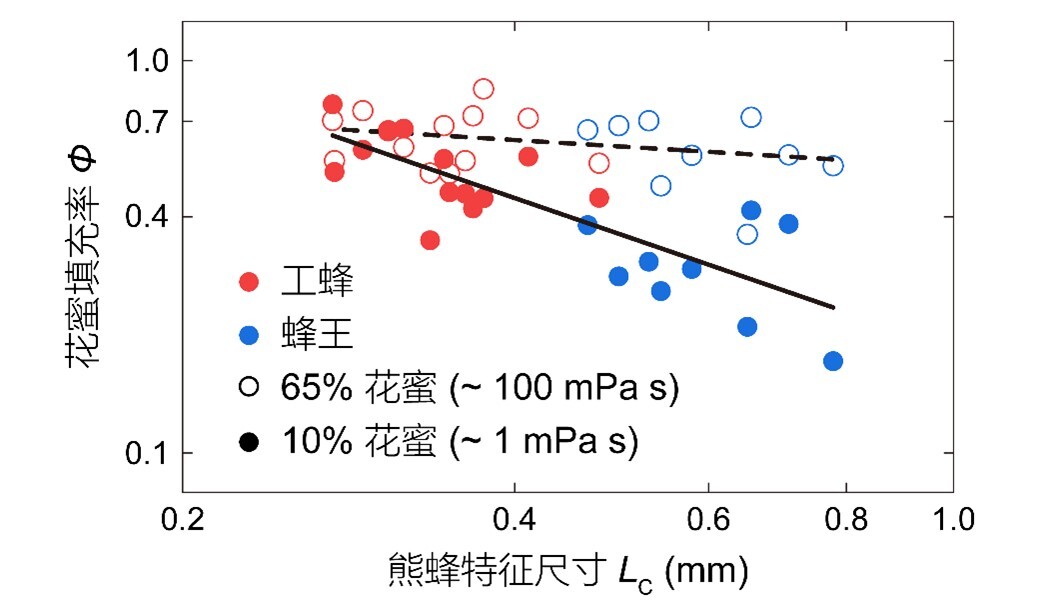 The research team simulated nectar by preparing sucrose solutions with varying sugar concentrations and injected them into glass capillaries with a diameter of 1 mm to mimic natural corolla scenarios for bumblebees to collect. Using high-speed microphotography, they quantitatively measured the volume of nectar ingested per glossa reciprocation. The study found that as individual body size increases, the volume ingested per reciprocation generally increases, but this growth is significantly slower than the rate at which the internal available space of the glossa increases with body size. Larger bumblebees do not proportionally gain higher effective intake. Particularly for queens, even with body sizes similar to workers, due to their wider hair spacing, the nectar fill rate of their glossa is lower than that of workers. In summary, larger bumblebees with wider hair spacing find it more difficult to effectively utilize the internal space of their glossa for nectar storage.