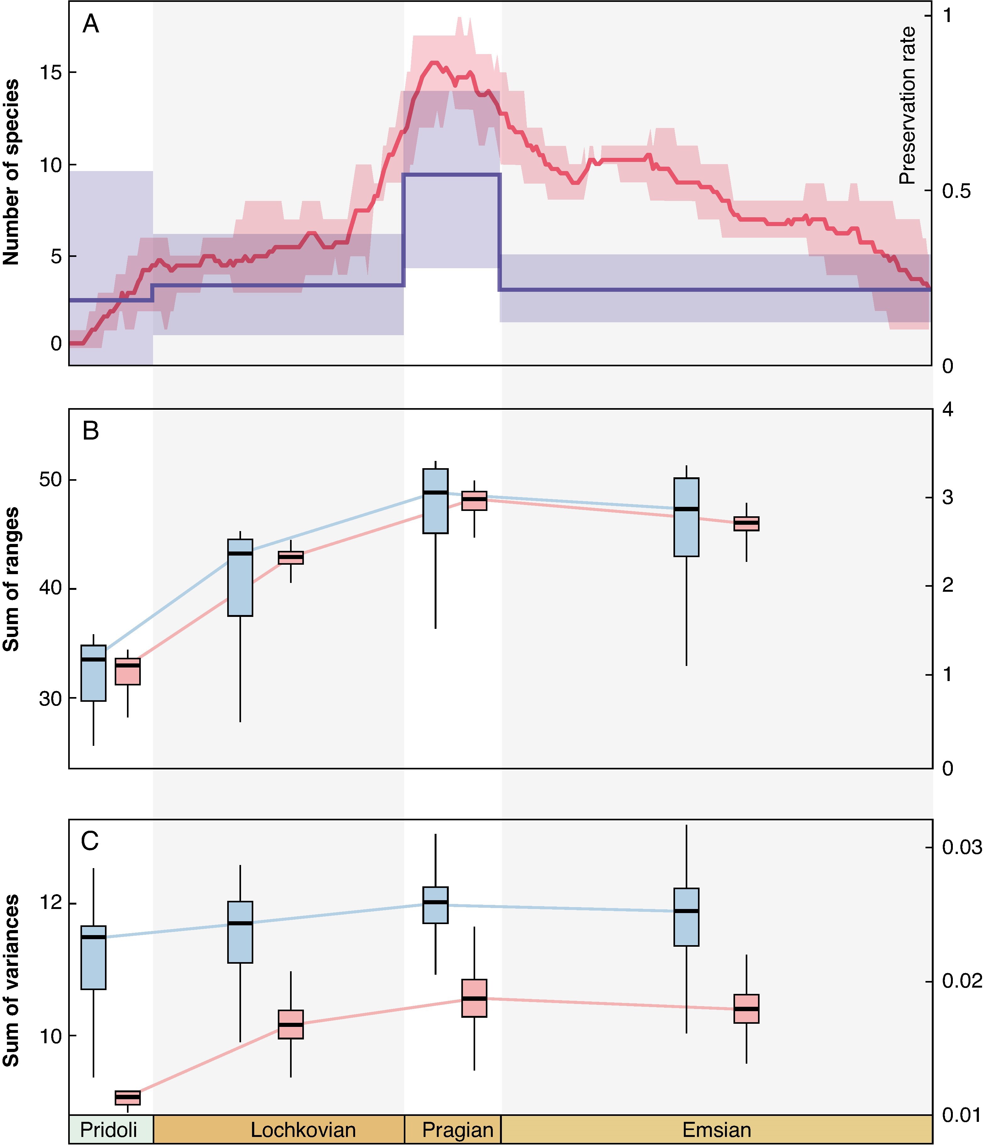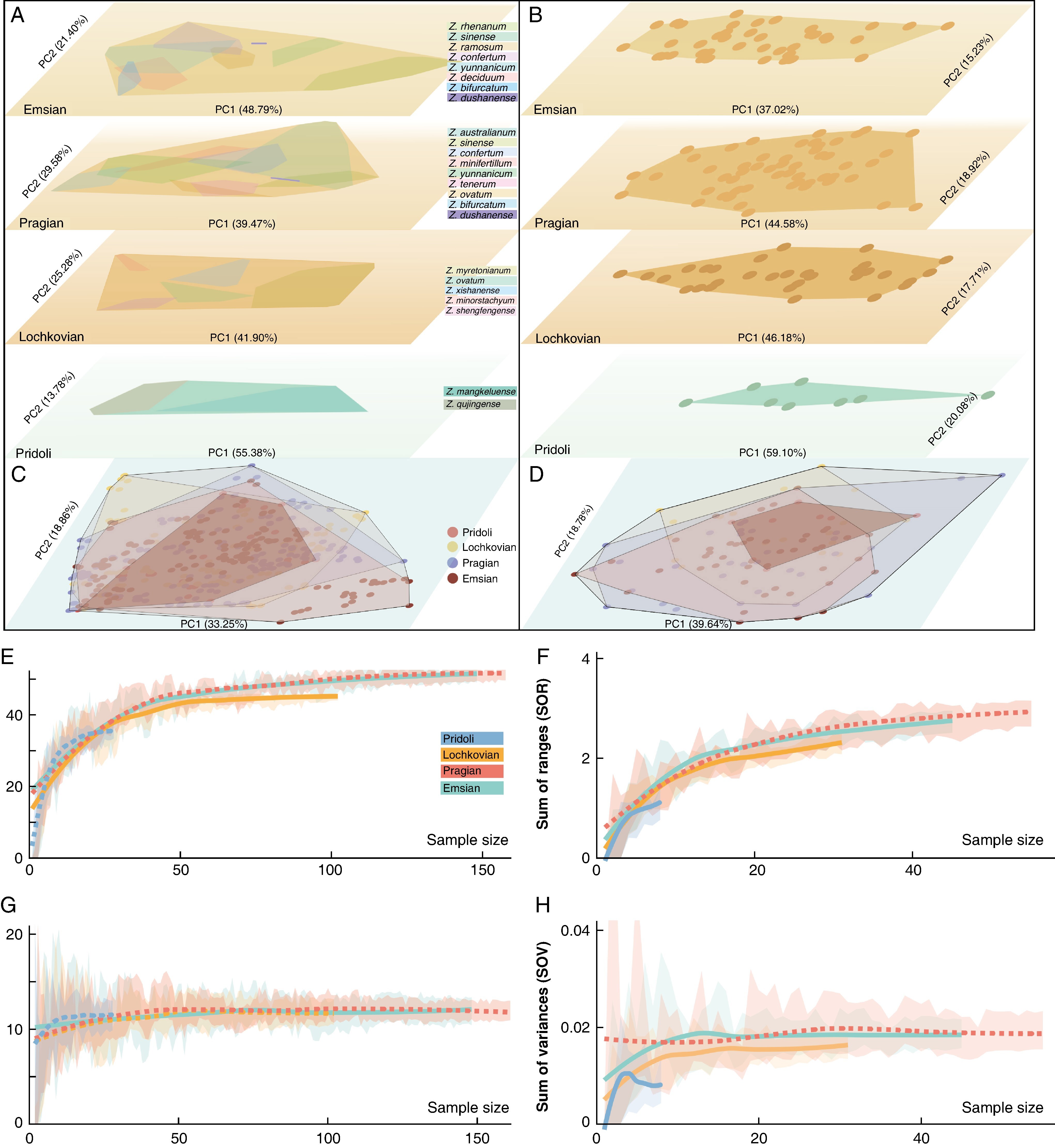 Furthermore, the team collected global fossil occurrence data of Zosterophyllum and morphological data from 18 Zosterophyllum species. Using methods such as morphospace and disparity analyses, diversity estimation etc., we traced the evolutionary trajectory of the genus from the Pridoli to the Emsian. The study found that while the species diversity of Zosterophyllum peaked during the Pragian of the Early Devonian, the principal expansion of its morphospace occurred earlier from the Pridoli to the Lochkovian. This reveals a decoupled evolutionary pattern between species diversity and the whole-plant morphological disparity, suggesting that morphological innovations serve as a key factor promoting species diversification in early vascular plants.