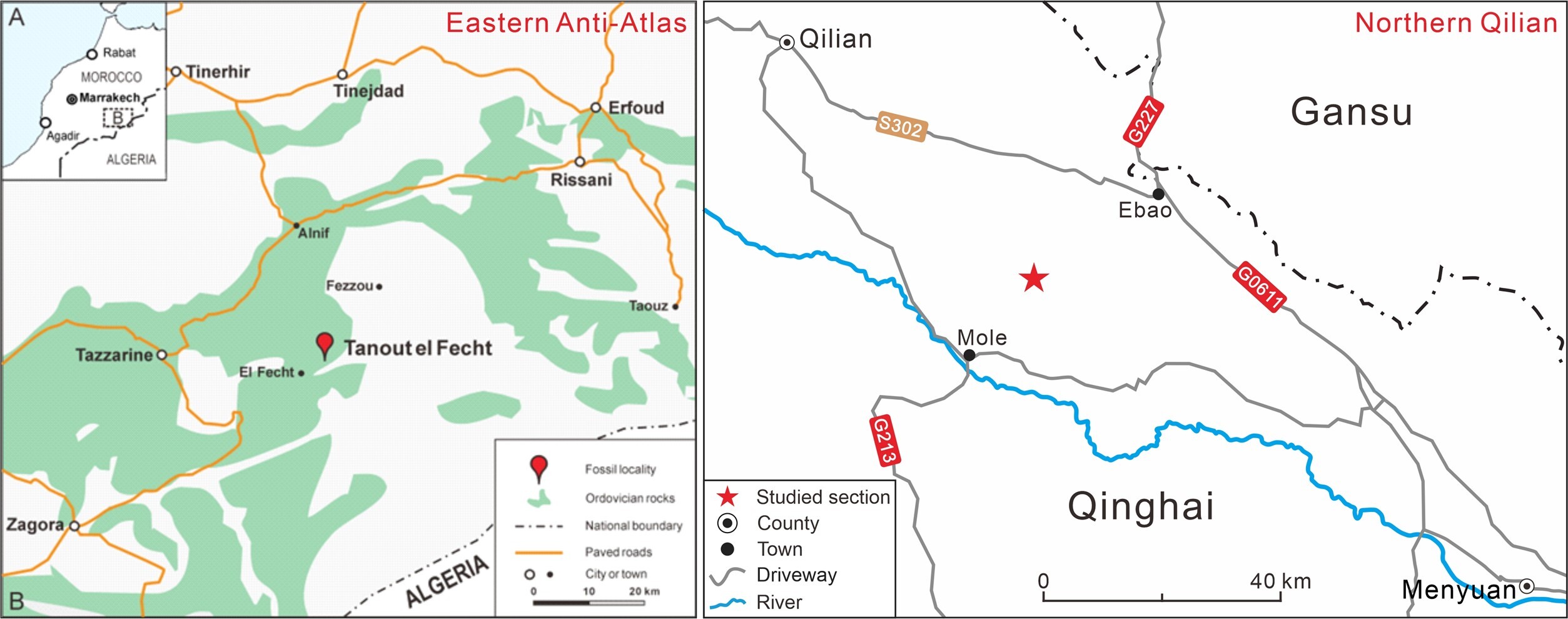 Geographical location of study areas and sections (Left: Anti-Atlas; Right: Qilian)