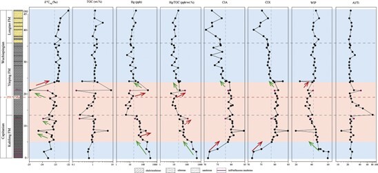 The research team conducted high‑resolution analyses on the Yinpingshan section, including zircon U–Pb geochronology, elemental geochemistry, mercury (Hg) proxies, and organic carbon isotopes (Fig. 1). The results reveal two distinct phases of Hg anomalies. Early, intense Hg anomalies linked to continental arc volcanism show minimal concurrent carbon isotope excursions and low chemical weathering indices, indicating limited global climatic impact.