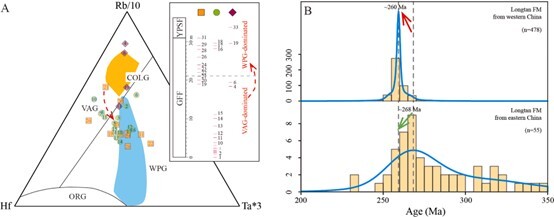 Fig. 2. (A) Tectonic discrimination diagrams of the Permian tuff or tuffaceous mudstone samples. (B) Comparison of the youngest detrital zircon age populations in the Longtan Formation between eastern and western China.
