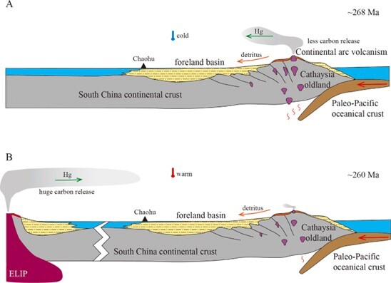 In stark contrast, later, weaker Hg anomalies associated with the ELIP coincide with significant negative carbon isotope excursions and evidence for enhanced chemical weathering, pointing to massive CO2 emissions that drove global warming. The study further shows that following peak volcanism, intensified silicate weathering and organic carbon burial facilitated atmospheric CO2 drawdown, leading to subsequent cooling.