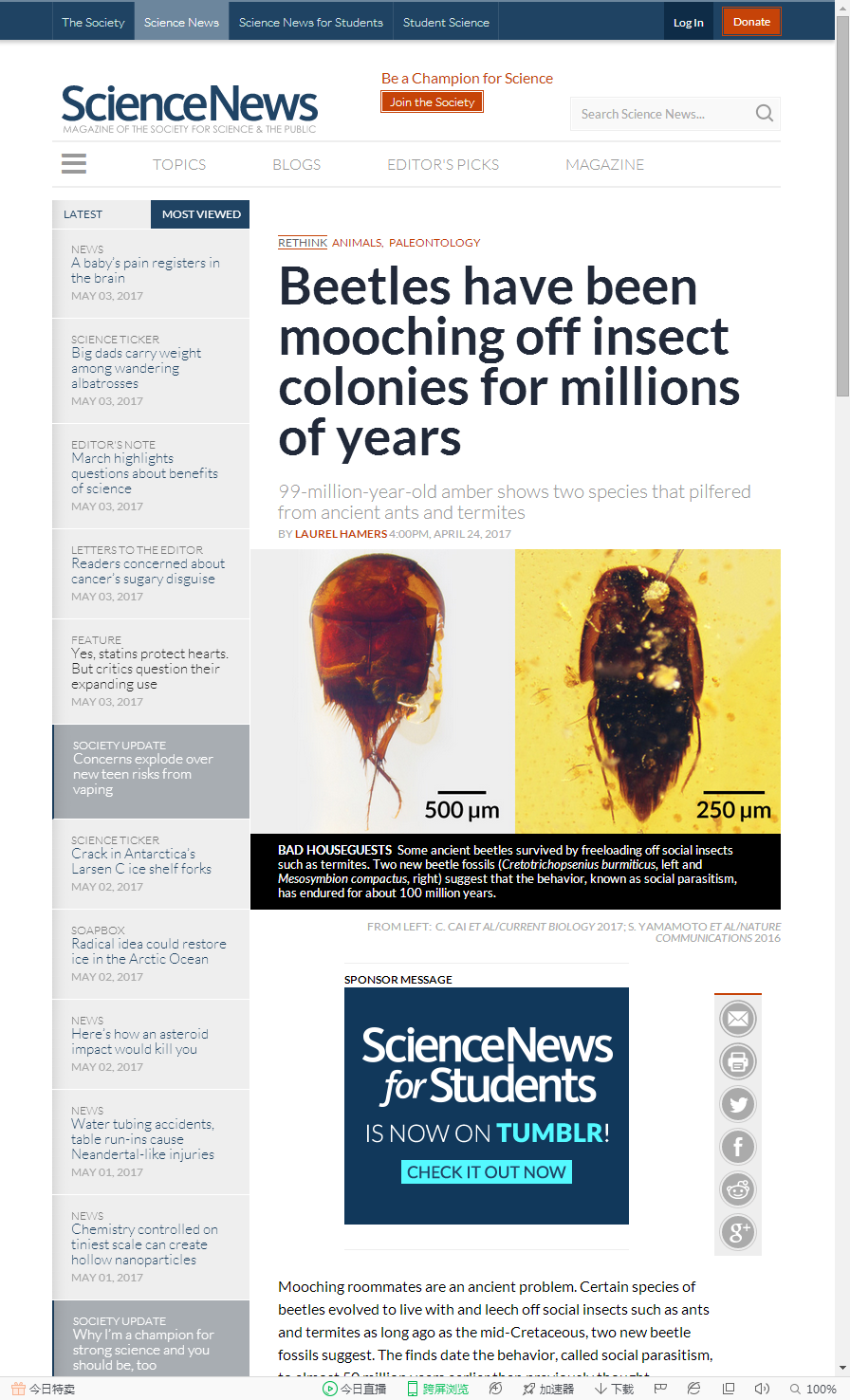 Mooching roommates are an ancient problem. Certain species of beetles evolved to live with and leech off social insects such as ants and termites as long ago as the mid-Cretaceous, two new beetle fossils suggest. The finds date the behavior, called social parasitism, to almost 50 million years earlier than previously thought.