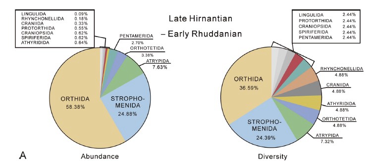Diagram showing the generic (diversity) and specimen (abundance) percentages of various major groups of late Hirnantian and early Rhuddanian brachiopods (theCathaysiorthis fauna), and late Katian brachiopods in the Jiangnan Region, Southeast China. Classification of extinction events and... |